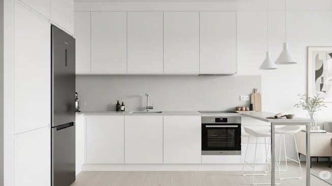 Desain L-shaped sangat efisien untuk memaksimalkan ruang sudut. Tata letak ini memungkinkan integrasi yang baik antara area persiapan, memasak, dan penyimpanan. Pilih perlengkapan dapur modern dengan desain minimalis untuk mempertahankan tema keseluruhan.
