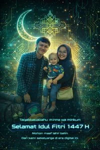 Prompt: "Transformasikan foto keluarga yang diunggah menjadi kartu Idul Fitri bergaya futuristik digital. Posisikan keluarga di bagian tengah dengan efek holographic glow neon. Latar belakangnya adalah cyber space dengan bulan sabit digital yang bersinar terang, serta pola kaligrafi Islami berbentuk neon. Tambahkan elemen teknologi seperti efek partikel dan pola sirkuit berwarna hijau, emas, dan biru. Ciptakan nuansa sci-fi modern namun tetap mempertahankan unsur Islami. Foto keluarga harus diberi sentuhan glitch subtle dan aura digital. Teks bergaya font futuristik ditempatkan di bagian bawah: ‘Taqabbalallahu minna wa minkum Selamat Idul Fitri 1447 H Mohon maaf lahir batin. Dari kami sekeluarga di era digital ini.’ Gaya visual yang diinginkan adalah ultra modern, cyberpunk Islamic fusion, high-tech aesthetic."