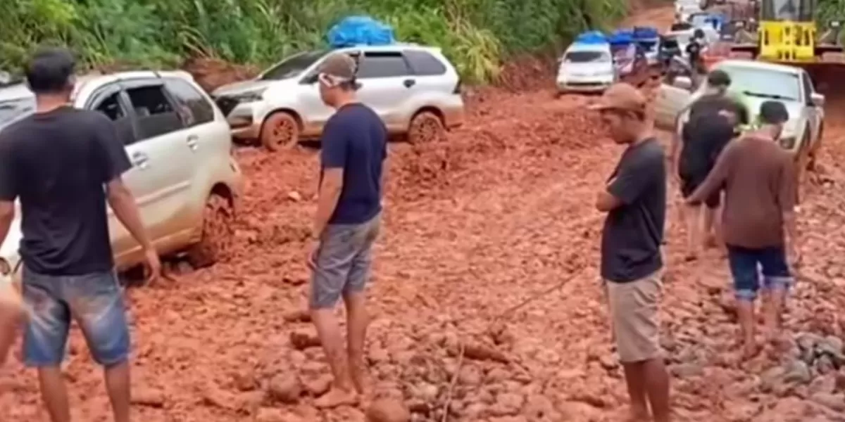 Rekaman video menunjukkan kondisi jalan berupa tanah merah basah akibat hujan, membuat kendaraan sulit untuk bergerak maju. Selain kubangan lumpur, terlihat pula tumpukan batu yang semakin mempersulit laju kendaraan roda empat. Beberapa mobil bahkan terpaksa berhenti karena tak mampu melanjutkan perjalanan.