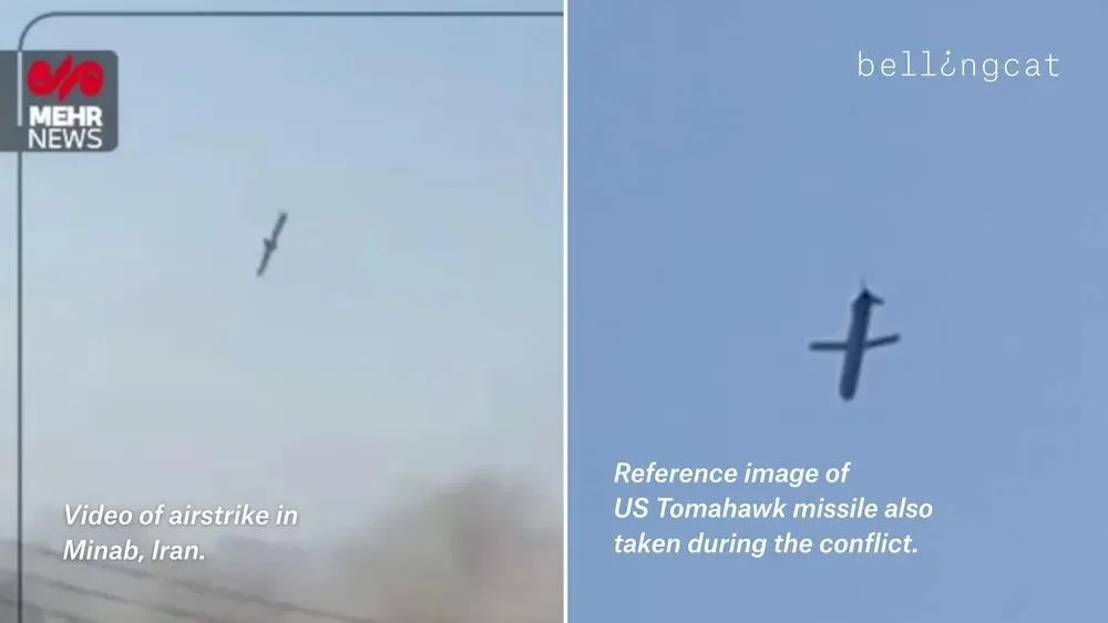 Menurut Bellingcat, rudal Tomahawk memiliki ciri khas pada bentuknya, pola penerbangannya, serta karakteristik ledakan yang spesifik. Tim riset ini menemukan kesamaan yang mencolok antara rekaman video serangan tersebut dengan rekaman serangan lain di wilayah Minab. Serangan-serangan sebelumnya tersebut diklaim sebagai bagian dari operasi militer Amerika Serikat.